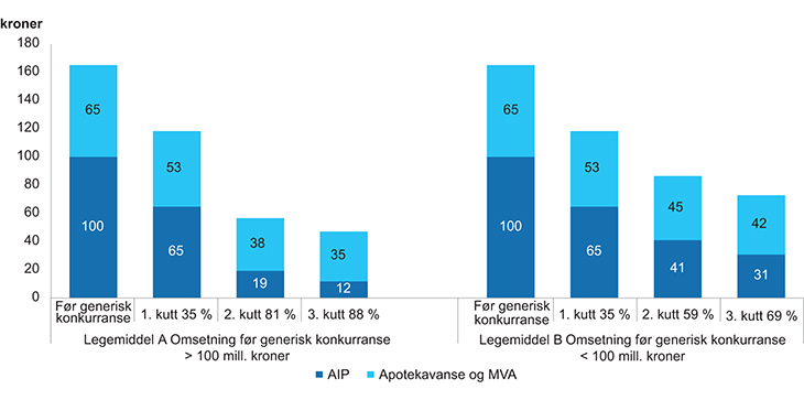 Omsetning før generisk konkurranse | 1. trinnpriskutt (umiddelbart) | 2. trinnpriskutt (etter seks måneder) | 3. trinnpriskutt (tidligst etter 18 måneder) | |