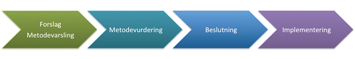 Systemet kan deles inn i fire hovedfaser, jf. figur 19.3. Alle fasene i systemet er under utvikling og implementeres gradvis. Det vil være hensiktsmessig å evaluere systemet når alle trinnene er implementert og utprøvd. Systemet for nye metoder er under utvikling og evalueres og forbedres fortløpende i dialog med aktørene, pasientorganisasjoner, fagmiljøer og industrien. Departementet vil i forbindelse med arbeidet med prioriteringsmeldingen vurdere ev. endringer i systemet, herunder behovet for ev. unntaksordninger.