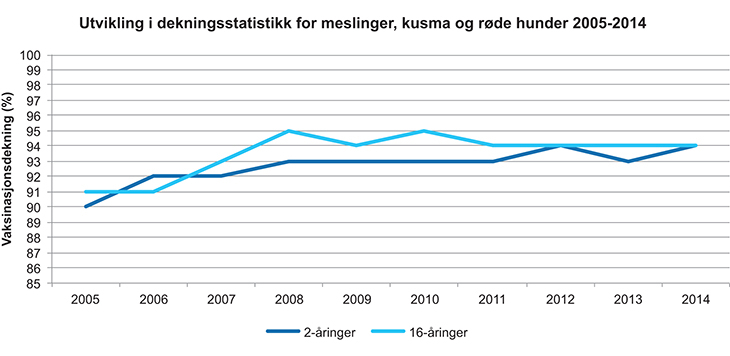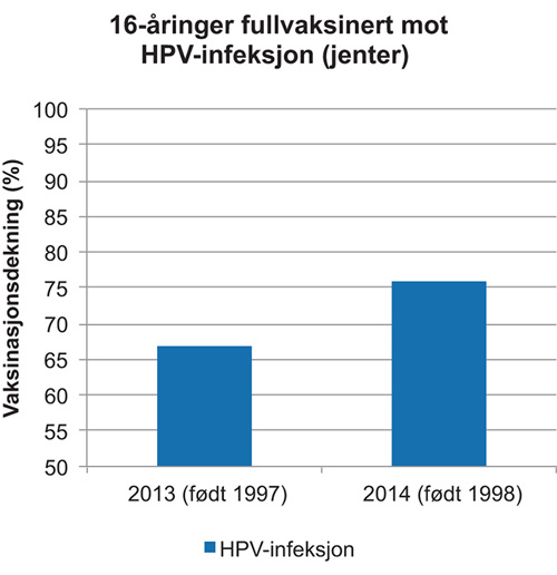 I Norge har vi høy oppslutning om barnevaksinasjonsprogrammet, og det arbeides kontinuerlig med å opprettholde dette10. Gjennomgang av den nasjonale vaksinasjonsdekningen i 2014 (SYSVAK-registeret), viser at de aller fleste barn og unge i Norge får de vaksinene som er anbefalt i barnevaksinasjonsprogrammet. Særlig vaksinasjonsdekningen mot meslinger, kusma og røde hunder (MMR) har holdt seg stabilt høy. 31. desember 2014 var 94 pst. av landets 2-åringer, 95 pst. av landets 9-åringer og 94 pst. av landets 16-åringer fullvaksinerte mot meslinger, kusma og røde hunder. Vaksinen med lavest dekning er vaksine mot humant papillomavirus (HPV) som ble introdusert som tilbud til alle jenter i 7. klasse fra og med skoleåret 2009/2010 (jenter født i 1997). SYSVAK-registeret for 2014 viser en økning i andelen 16 år gamle jenter som er fullvaksinert mot HPV-infeksjon på 9 prosentpoeng sammenliknet med året før. Fortsatt ligger dekningen imidlertid under 80 pst.