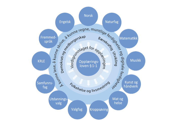Elevenes læring og utvikling i skolen foregår i stor grad gjennom arbeidet med skolefag. Opplæringen er organisert i fag, hvert fag har en læreplan, og det er fastsatt et bestemt antall timer til de ulike fagene. Grunnopplæringen har en allmenndannende funksjon og skal stimulere elevenes deltakelse i samfunnsliv og fritid uavhengig av hvilke interesser de har, og om de skal ta høyere utdanning eller skal inn i et yrke. For at elevene skal velge utdanning og yrke ut fra interesser og anlegg og kunne bidra på ulike områder i arbeidsliv og samfunn, må skolen gi elevene et grunnlag innenfor mange fagområder.