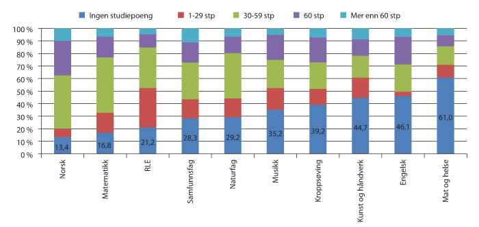 Figur 7.3 viser at det er i de praktiske og estetiske fagene og i engelsk at det er størst andel lærere på mellomtrinnet som har få eller ingen studiepoeng.