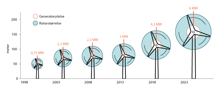Høyden på turbinen viser utviklingen i totalhøyde, mens størrelsen på sirklene illustrerer den relative utviklingen for generatorens ytelse og rotorens størrelse. Størrelsen i 2023 er estimert.