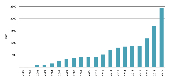 Fotovoltaisk solkraft, det vil si elektrisk kraft utvunnet direkte av sollyset, er den produksjonsteknologien som vokser raskest i verden. I 2019 ble det installert over 121 GW solkraft globalt7, slik at den samlede ytelsen var godt over 600 GW ved inngangen til 2020.