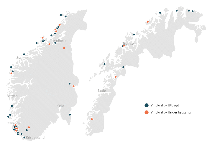 Områdene med tettest utbygging i Norge er Rogaland og Trøndelagskysten. En oversikt over alle vindkraftverk som er utbygd, eller under bygging, per april 2020 vises på kart i figur 2.4 og i tabell 2.1.