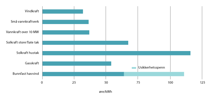 Figuren viser energikostnad over levetiden, eller LCOE, for utvalgte produksjonsteknologier. Kostnadene for små vannkraftverk, vindkraft og solkraft er beregnet av NVE basert på utbyggingskostnader for prosjekter satt i drift i 2019. For større vannkraftverk er kostnadene basert på utbyggingskostnader i perioden 2010–2019. I Norge er solkraft installert nesten utelukkende på tak. Kostnaden er betydelig lavere når solkraft er installert på store tak (typisk næringsbygg) sammenlignet med ordinære hustak. For vindkraft til havs (bunnfast) er kostnadene modellert for området Sørlige Nordsjø II basert på globale kostnadstall for utbygginger i 2019. Her er det stor usikkerhet og det er derfor angitt et intervall for energikostnaden. Det er foreløpig bygget kun få flytende vindkraftverk, og det er ikke grunnlag for å estimere det generelle kostnadsnivået. Kostnadene for gasskraft er blant annet basert på forutsetninger i NVEs langsiktige kraftmarkedsanalyse fra 2019, der gassprisen har stor innvirkning på energikostnaden.