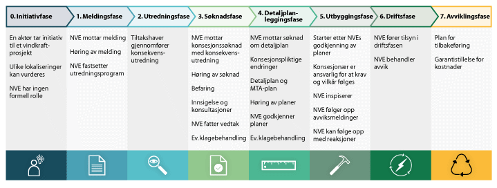 For å bygge, eie og drive et vindkraftverk kreves det konsesjon etter energiloven1. En vindkraftkonsesjon gjelder for inntil 30 år innenfor et nærmere fastsatt geografisk område, og angir en øvre grense for maksimal installert effekt (MW). Mindre vindkraftanlegg med inntil 5 vindturbiner og en samlet installert effekt under 1 MW er ikke konsesjonspliktig, og behandles av kommunene etter reglene i plan- og bygningsloven. For større anlegg må det søkes om konsesjon hos NVE. Formålet med en konsesjonsordning for vindkraft er at myndighetene kan regulere og kontrollere virksomheten slik at den foregår på en samfunnsmessig rasjonell måte, jf. energilovens formålsbestemmelse (§ 1-2). Saksgangen frem til en konsesjon gis eller søknaden avslås er en omfattende prosess over flere år. Prosessen skal følge relevant lovverk, være åpen, demokratisk og sikre tilstrekkelig kunnskap om det omsøkte prosjektet før vedtak fattes av NVE, jf. figur 3.1.