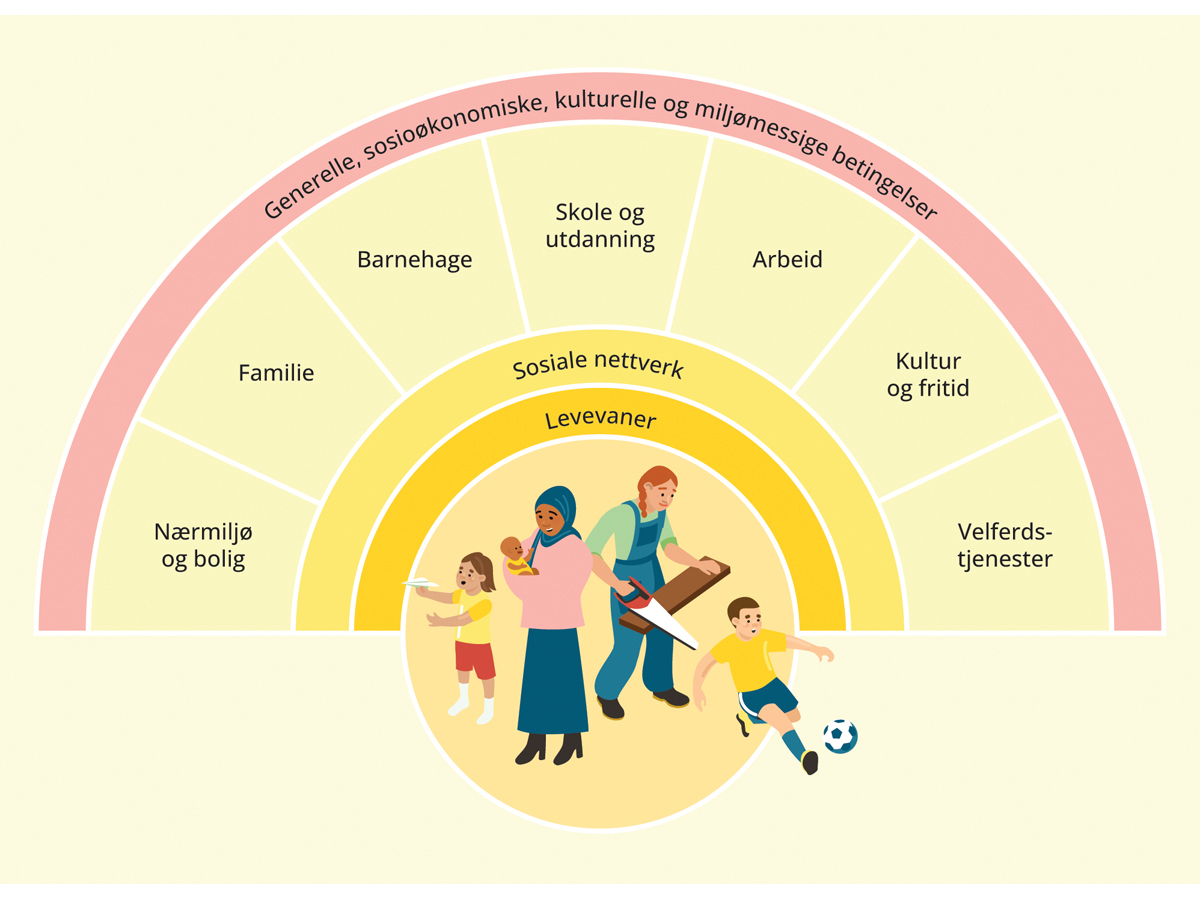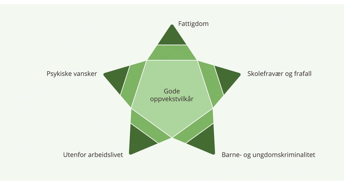 Figur 1.2 Figuren viser ulike forhold som kan bidra til god oppvekst, og illustrerer hvordan barn og unges oppvekstvilkår påvirkes av mange ulike faktorer