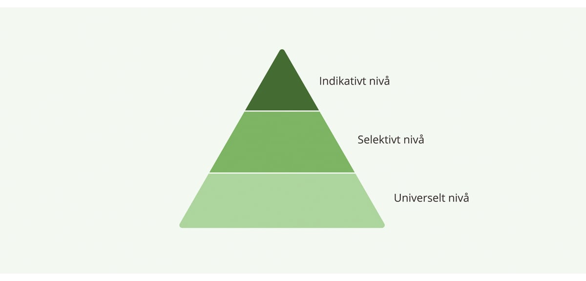 Det er vanlig å skille mellom ulike nivåer av forebygging, basert på ulike målgrupper for innsatsen. Nivåene kan illustreres som en pyramide: