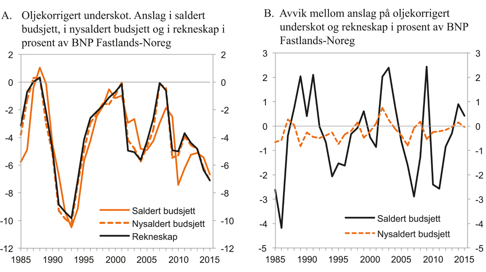 Figur 1.1.B syner avvik mellom budsjett og rekneskap for den oljekorrigerte budsjettbalansen. Der avviket er mindre enn null, har ein budsjettert med eit større oljekorrigert underskot enn det som vart resultatet i rekneskapen. Nokre år er avviket mindre enn null og andre år større enn null og i om lag 1/3 av åra var avviket frå saldert budsjett til rekneskap større enn null. Tala tyder på at det ikkje er systematiske over- eller undervurderingar.