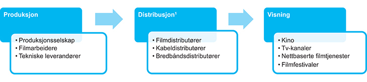 Det digitale markedet utfordrer eksisterende forretningsmodeller og inntektsstrømmene i den norske filmbransjen. Figur 3.1 illustrerer verdikjeden i filmbransjen, fra produksjons- til formidlingsleddet. Økonomien i de ulike verdileddene er avgjørende for hvilke filmer og serier som blir produsert og formidlet til publikum.