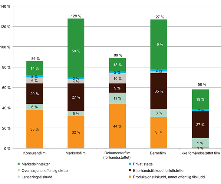 Dokumentar- og spillefilmprosjekt mottar betydelig mer i norske offentlige tilskudd. Offentlig tilskudd utgjør hhv. 43 og 34 pst. av produksjonsbudsjettene til spillefilm- og dokumentarproduksjoner.