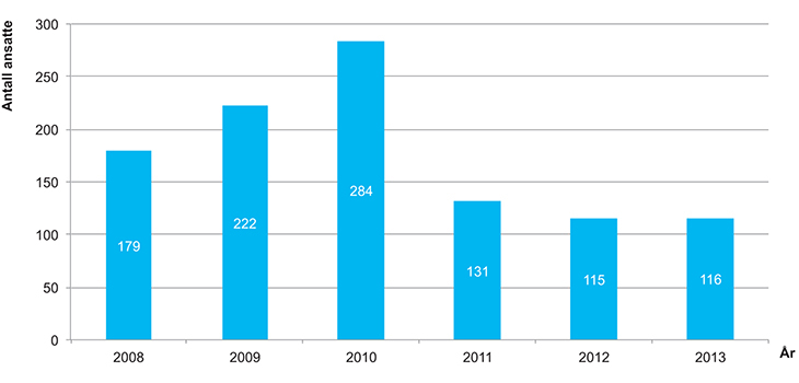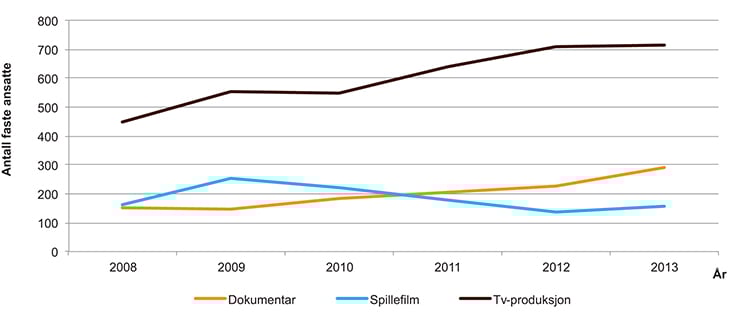 Figur 3.3 Utviklingen over antall fast ansatte i tv- og filmproduksjonsbransjen 2008–2013