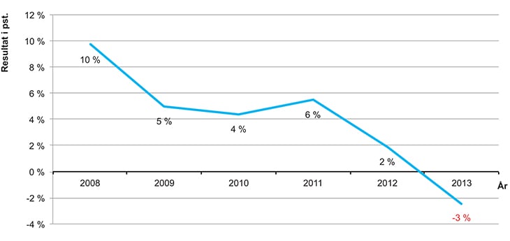 Figur 3.5 Samlet årsresultat 2008–2013 (i mill. kroner)