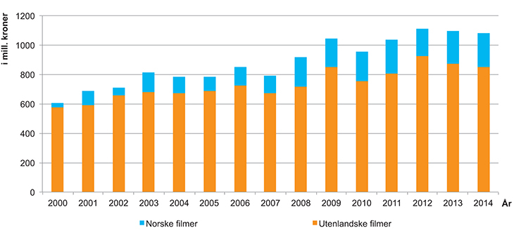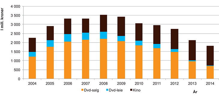 1 Dvd- og blu-ray-tallene er noe usikre, spesielt noen år tilbake, men antas likevel å gi et ganske riktig bilde over utviklingen. Tallene viser omsetning til forbruker. Alle tall er inkludert merverdiavgift. Kinoenes omsetning tar kun utgangspunkt i billettinntektene.