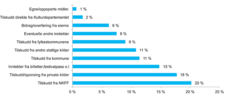 Ifølge en kartlegging av filmfestivalene i 201324 utgjør salg av billetter og festivalpass i gjennomsnitt kun 15 pst. av filmfestivalenes totale inntekter. De fleste filmfestivalene er derfor avhengige av ekstern finansiering. Som det framgår av figur 3.17, er filmfestivalene dyktige til å innhente kapital fra regionale myndigheter og privat kapital fra andre aktører som ser nytten av filmfestivaler. Samtidig er også de offentlige midlene som bevilges fra Norsk kino- og filmfond (NKFF) av stor betydning.