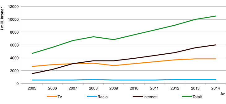 For de kommersielle tv-selskapene utgjør inntekter fra reklamevisning den viktigste inntektskilden. Ifølge tall fra IRM/medienorge, som er presentert i figur 3.18, økte reklameinntektene for de kommersielle norske tv-selskapene med om lag 0,8 mrd. kroner i perioden 2010 til 2014. Det er imidlertid Internett som har opplevd den største økningen i reklameinntekter de siste årene, og det er fare for at reklameinntektene i økende grad flyttes fra tv til Internett.