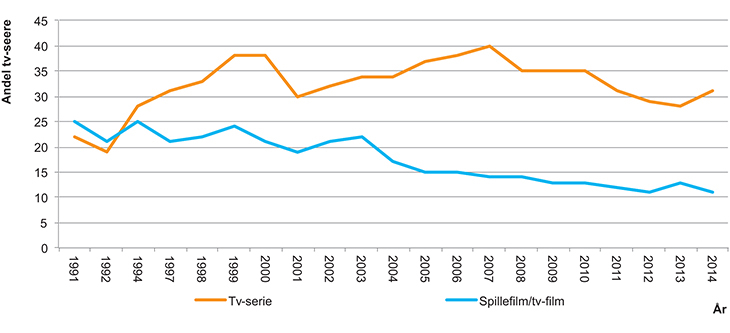 Figur 3.19 Andel tv-seere som har sett serier og spillefilm på tv en gjennomsnittsdag 1991–2014 (i pst.).