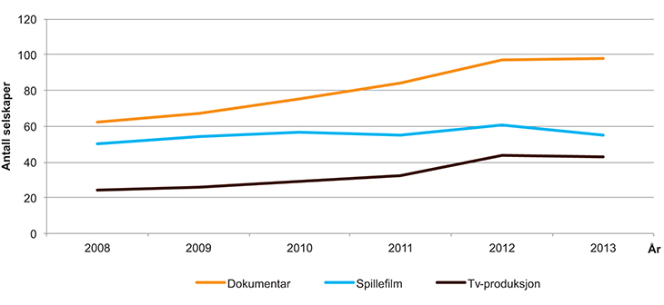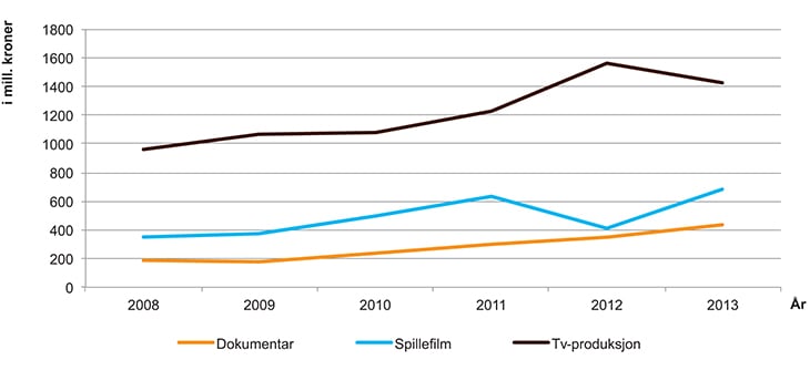 Omsetningen i filmproduksjonsbransjen har vokst med over 50 pst. i perioden 2008 til 2013, og i 2013 omsatte den samlede norske tv- og filmbransjen for om lag 2,5 mrd. kroner. Figur 3.4 viser utviklingen i omsetningsnivået for de ulike produksjonsselskapene i perioden. Tv-produsentene har drevet fram den største omsetningsveksten, mens dokumentarprodusentene oppnår den høyeste relative veksten. Omsetningen i spillefilmbransjen vokser jevnt fram til 2011 og faller kraftig tilbake i 2012, før den tar seg opp igjen i 2013.