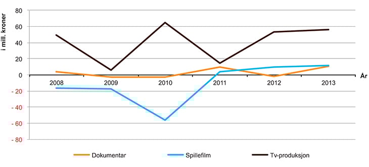 Som illustrert i figur 3.5 oppnår tv-, spillefilm-, og dokumentarbransjen svært ulik lønnsomhetsutvikling i perioden 2008 til 2012. Mens den samlede tv-produksjonsbransjen går med overskudd hvert år, svinger lønnsomheten til spillefilmprodusentene fra et samlet underskudd i årene 2008 til 2010, til et mindre overskudd i perioden 2011 til 2013. Lønnsomheten for dokumentarbransjen stabiliserer seg rundt null, og har noen år med et mindre underskudd og noen år med et lavere overskudd.