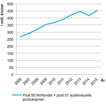 NFI forvalter de statlige tilskuddsordningene for audiovisuelle produksjoner og legger i stor grad rammebetingelsene for offentlige tilskudd til norske filmer og serier. I 2015 var bevilgningene over postene 50 og 51 på statsbudsjettet 452,2 mill. kroner. Figur 3.6 viser utviklingen i bevilgningene over statsbudsjettet post 50 og 51 i perioden 2006 til 201510.