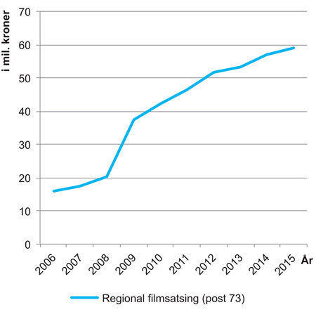 I tillegg til at NFI har et nasjonalt ansvar for filmpolitikken, er det opprettet regionale filmsentre og filmfond. De regionale filmsentrene og filmfondene som vokste fram på 2000-tallet etter initiativ fra lokale aktører, har blitt en del av den nasjonale filmpolitikken. Figur 3.8 viser utviklingen i statlige bevilgninger til regionale filmsentre og filmfond i perioden 2006 til 2014. I 2014 var bevilgningene på om lag 57 mill. kroner. Midlene ble fordelt med vel 46 mill. kroner til åtte filmsentre og 11 mill. kroner til fem filmfond. Det har vært en økning i bevilgningen over post 73 fra 26,7 mill. kroner i 2008 til 57 mill. kroner i 2014, tilsvarende en vekst på 113 pst. Bevilgningene i 2014 utgjør likevel kun 14 pst. av alle midler til filmformål. Kap. 7 gir en grundigere omtale av de regionale filmvirksomhetene.