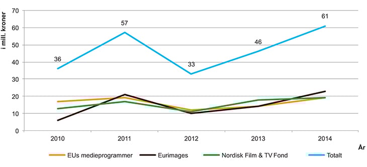 Som illustrert i figur 3.9, mottar norsk filmbransje også betydelige tilskudd fra de overnasjonale programmene som Norge deltar i. Tilskudd fra overnasjonale programmer til norske mottakere har til sammen utgjort mellom 40 og 60 mill. kroner per år i perioden 2010 til 2014.