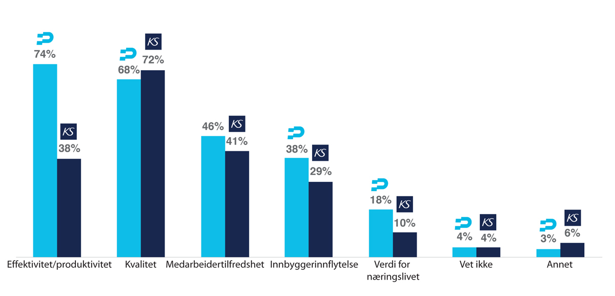 Figuren viser hvilke effekter virksomhetene rapporterer av innovasjon i henholdsvis staten (merket med logoen til Difi, nå Digitaliseringsdirektoratet) og helse- og omsorg og utdannings- og opplæringssektoren i kommunene (merket med logoen til KS).