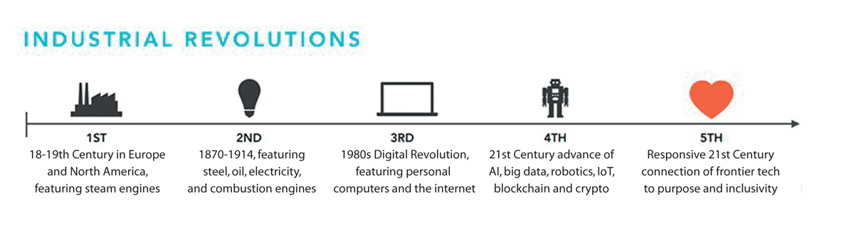 Det er blitt hevdet at utviklingen kan gå i retning av en femte industriell revolusjon. Den fjerde revolusjonen, som vi anses å være inne i nå, er preget av digitalisering, automatisering, robotisering og maskinlæring. Den femte revolusjonen tar teknologien i bruk for å fremme bærekraft og menneskelige behov (figur 6.2).6