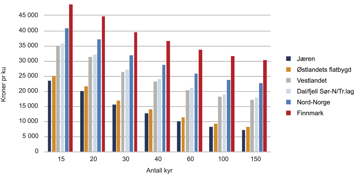 Figuren ovenfor viser stor forskjell i samlede tilskuddsutbetalinger per melkeku i ulike deler av Norge og med ulike bruksstørrelser. Søylene i figuren viser at det gis vesentlig mer støtte per ku til bruk i melkeproduksjon i Finnmark, Troms og Nordland enn i de ulike delene av Sør-Norge.