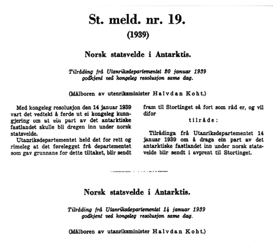 «Kongen samtykkjer og skriv under eit framlagt utkast til kongeleg kunngjering om at den parten av fastlandsstranda i Antarktis som tøyer seg ifrå grensa for Falkland Islands Dependencies i vest (grensa for Coats Land) til grensa for Australian Antarctic Dependency i aust (45° austleg lengd) med det landet som ligg innafor denne stranda og det havet som ligg innåt, blir dregen inn under norsk statsvelde».
