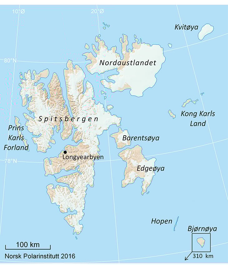 Svalbard er den nordligste delen av Norge og er navnet på en øygruppe bestående av Spitsbergen, Prins Karls Forland, Nordaustlandet, Kong Karls Land, Barentsøya, Edgeøya, Hopen, Bjørnøya og alle holmer og skjær innenfor koordinatene 10 og 35° østlig lengde og 74 og 81° nordlig bredde. Med et landareal på 61 022 km2 utgjør Svalbard ca. 16 pst. av Kongeriket Norges totale landareal. Spitsbergen er den største øya i Norge og er omtrent på størrelse med fylkene Nordland og Troms til sammen.
