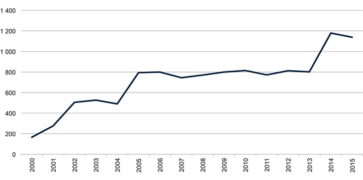 Figur 6.3 Økningen i antall havneanløp i Longyearbyen i perioden fra 2000.