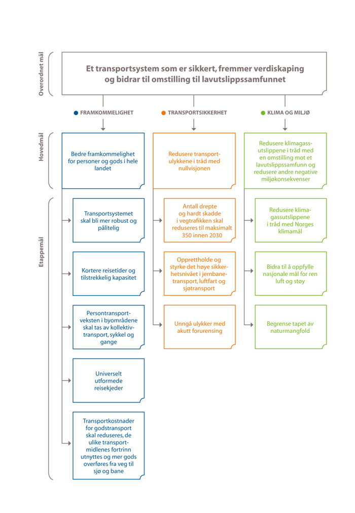 Regjeringens målstruktur for transportsektoren er grunnlaget for prioriteringene i denne transportplanen. Det overordnede målet Et transportsystem som er sikkert, fremmer verdiskaping og bidrar til omstilling til lavutslippssamfunnet peker ut den langsiktige retningen for utviklingen av transportsystemet (frem mot 2050). De tre hovedmålene beskriver både hva som er transportsystemets primære funksjon (framkommelighet) og hvilke hensyn som skal tas ved utviklingen av dette (trafikksikkerhet og klima og miljø). Etappemålene uttrykker konkrete mål for planperioden, med indikatorer knyttet til seg. Disse gir viktig informasjon om hva som oppnås i planperioden og om oppfølgingen av Nasjonal transportplan i de årlige budsjettene.