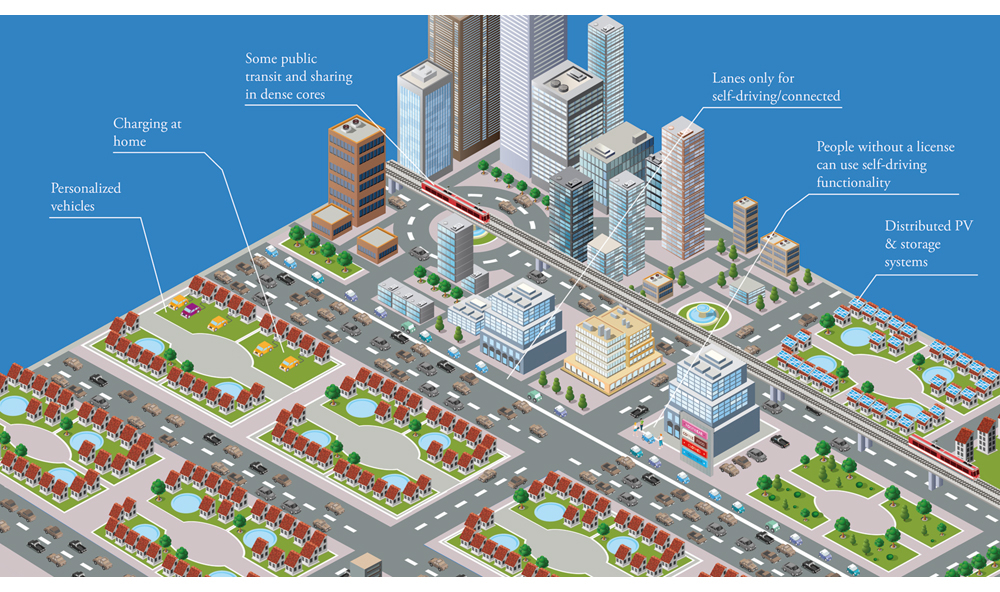 An Integrated Perspective on the Future of Mobility, Bloomberg New Energy Finance/McKinsey & Company1. Rapporten trekker frem en rekke trender som påvirker mobilitet, eksempelvis elektrifisering av kjøretøy, delt mobilitet, selvkjørende kjøretøy, Internet of Things, sammenkobling, kollektivtransport, bærekraftige boområder, urbanisering, desentralisering av energisystemet og hvordan interaksjonen mellom disse virker forsterkende på de enkelte effektene. Det fremheves i rapporten at byene blir sentrale i første stadium i endringen av transportsystemet, og at det kan ta svært ulik form i ulike byer. Dette avhenger av hvor tettbygd byene er, inntektsnivå og hvordan transportsystemet i byen er i dag, eksempelvis hvor mange som i dag eier egen bil. Utfra dette identifiseres tre mulige «mobilitetsfremtider»: «Clean and shared (ren og delt)», Private autonomy (privat autonomi)» og «Seamless mobility (sømløs mobilitet)». Rapporten konkluderer med at myndighetene kan realisere samfunnsmessige goder ved å fjerne hindringer for omlegging til mer avansert mobilitet. Myndighetene bør ifølge rapporten sørge for reguleringer som tar hensyn til teknologiske muligheter, også i forkant av at forbrukerne tar disse i bruk. Videre pekes det på behovet for tilrettelegging for ladbare kjøretøy og for å se på incentiver som styrer mot delte autonome kjøretøy fremfor private.