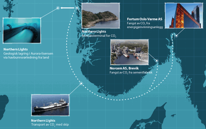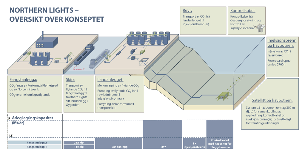 Det er modna fram ei løysing for CO2-handtering i industriell skala som legg til rette for at CO2-handtering kan utviklast vidare både i Noreg og Europa. Prosjektet har omfatta fangst av CO2 frå Norcem sin sementfabrikk i Brevik i Porsgrunn kommune, fangst av CO2 frå Fortum Oslo Varme sitt avfallsforbrenningsanlegg på Klemetsrud i Oslo kommune. Northern Lights har hatt ansvaret for CO2-transport- og -lagringsdelen av prosjektet som har omfatta skip for transport av flytande CO2 og ein mottaksterminal i Øygarden kommune med røyr til ein brønn der CO2 skal bli injisert i ein lagringsformasjon under havbotnen i Utnyttingsløyve 001, også kalt Aurora, sjå figur 4.1.