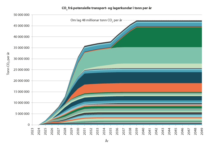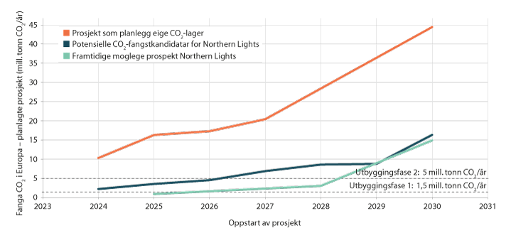 Northern Lights har kontakt med utsleppseigarar i Europa som vurderer å nytte eit norsk lager, under føresetnad av at ei heil kjede vert etablert. Carbon Limits og Thema Consulting har på oppdrag frå Olje- og energidepartementet vurdert aktuelle prosjekt under utvikling i Europa [25]. Konsulentane har funne 41 prosjekt under utvikling i Europa på ulikt modningsnivå. Åtte av desse prosjekta planlegg å utvikle eigne CO2-lager, men vurderer å bruke Northern Lights som reserveløysing. Dette er vist i den øvre linja i figur 4.9 «prosjekt som planlegg eige lager». 11 prosjekt planlegg å lagre CO2 i eit norsk lager, «potensielle CO2-fangstkandidatar for Northern Lights». Vidare er det identifisert 22 moglege prosjekt som er i tidleg planleggingsfase, «framtidige moglege prospekt Northern Lights». Desse prosjekta er hovudsakleg i land utan eigne CO2-lager og dersom dei blir realisert vil det kunne bety auka etterspørsel etter CO2-lagring i Noreg. Til saman vurderer difor Carbon Limits og Thema Consulting at marknadspotensialet for Northern Lights er mellom 20 og 60 mill. tonn CO2 årleg, jf. figur 4.9. Dersom alle potensielle og framtidige moglege fangstkandidatar for Northern Lights vert realisert etter tidsplanen, ville lagringskapasiteten på 1,5 mill. tonn CO2 per år bli nytta frå oppstarten i 2024, mens kapasiteten på 5 mill. CO2 i fase to ville blitt fylt opp frå 2026. Det er usikkert kor mange av dei identifiserte prosjekta som faktisk blir realisert og utsleppskjeldene er også avhengig av tredjepartsfinansiering.