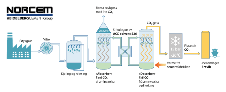To tredelar av utsleppa til Norcem kjem som eit resultat av prosessen med å omdanne kalkstein til sement. Den siste tredelen av utsleppa ved Norcem Brevik kjem som eit resultat av forbrenning og om lag 35 pst. av denne forbrenninga kjem frå biogene kjelder. Det er dermed allereie gjort eit omfattande arbeid med å redusere utsleppa frå sementproduksjonen, mellom anna gjennom å innføre alternative brensel. Norcem har valt Aker Carbon Capture som hovedkontraktør og leverandør av CO2-fangstteknologien. CO2 vert skild ut frå røykgassen og gjort flytande før den skal mellomlagrast ved kai i Grenland hamn, der det er lagringskapasitet til om lag fire døgn med produksjon.
