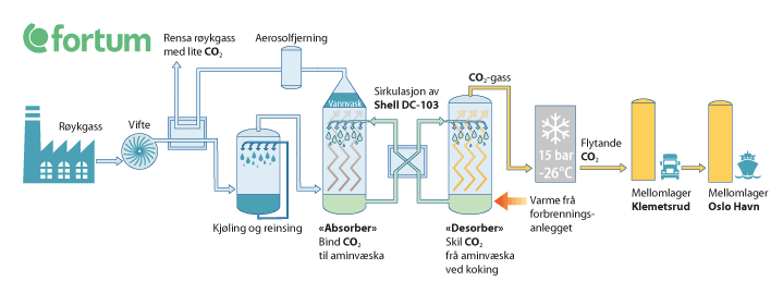 Fortum Oslo Varme planlegg å bygge og drive eit CO2-fangstanlegg som kan fange om lag 400 000 tonn CO2 per år frå eksisterande utslepp frå avfallsforbrenningsanlegget. Utsleppa frå Fortum Oslo Varme er ikkje omfatta av EUs klimakvotesystem, jf. boks 2.2. CO2 vert skilt ut frå forbrenningsanlegget, gjort flytande og mellomlagra i tankar på Klemetsrud. Frå desse tankane vil tankbilar frakte flytande CO2 til Oslo hamn der det er lagringskapasitet til CO2 frå om lag fire døgn med produksjon. Fortum Oslo Varme har valt TechnipFMC som hovedkontraktør og Shell som leverandør av CO2-fangstteknologi.