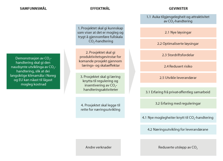 «Demonstrasjon av CO2-handtering skal gi den naudsynte utviklinga av CO2-handtering, slik at dei langsiktige klimamåla i Noreg og EU kan nåast til lågast mogleg kostnad»
