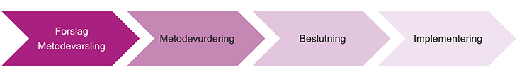 Fullstendige metodevurderinger brukes i hovedsak til å vurdere hele terapiområder samlet og utarbeides av Kunnskapssenteret i Folkehelseinstituttet. De fullstendige metodevurderingene kan bl.a. brukes til å sammenlikne ulike behandlingsalternativer etter en tids bruk og erfaring i klinisk praksis. Denne kunnskapen vil i neste trinn kunne understøtte justeringer i rangering av behandlingsanbefalinger, ev. også utfasing av eksisterende metoder. Figur 11.1 viser hovedfasene i systemet for innføring av nye metoder.