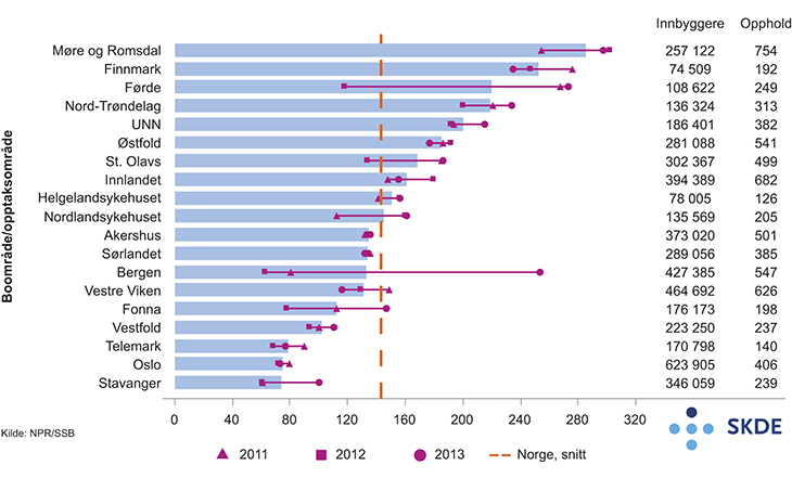 Senter for klinisk dokumentasjon og evaluering (SKDE) lanserte i januar 2015 en pilotversjon av et helseatlas som analyserer den norske befolkningens forbruk av 12 forskjellige typer dagkirurgiske inngrep i perioden 2011–2013. Atlaset viser store geografiske forskjeller i forbruk av for eksempel kirurgiske inngrep i skulder, mens forskjellene er mindre når det gjelder operasjoner for lyskebrokk. Et eksempel som viser variasjon i dagkirurgisk inngrep, skulderkirurgi, er vist i figur 15.1 nedenfor. Figuren viser kjønns- og aldersjusterte rater per 100 000 innbyggere per boområde, per år og gjennomsnitt for 2011 til 20131. For de fleste boområdene er det lite variasjon i forbruket fra år til år. For perioden samlet skiller boområdet Møre og Romsdal (høyest) seg ut med nesten fire ganger så høyt forbruk som boområdet Stavanger (lavest).