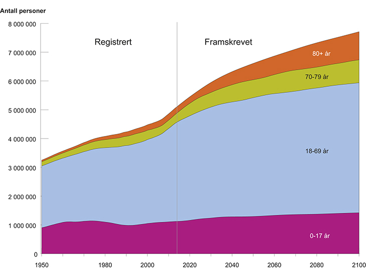 Figur 2.1 Folkemengde i fire aldersgrupper, registrert og fremskrevet til 2100.