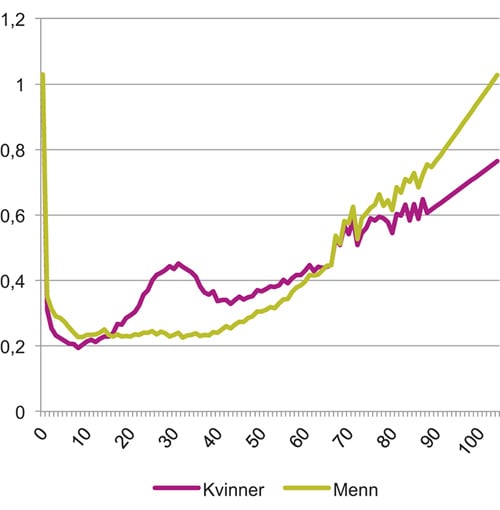 At forventet levealder øker er gledelig, både for samfunnet og for den enkelte, og er blant annet uttrykk for stigende levestandard og bedre helsetjenester. Når gjennomsnittlig levealder stadig øker, vil det samtidig bli flere eldre, og flere av de eldste vil ha stort behov for tjenester. Forbruket av helsetjenester blant 70-åringer er omtrent dobbelt så høyt som blant 40-åringer. Deretter øker behovet for og forbruket av tjenester med stigende alder. Figur 2.2 viser at brukerfrekvensen, dvs. forholdet mellom de som bruker spesialisthelsetjenesten og antall mennesker totalt på et alderstrinn, øker kraftig fra 60 år.