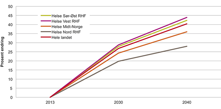 I Meld. St. 11 (2015--2016) Nasjonal helse- og sykehusplan (2016–2019) ble framskrivninger av folketall og konsekvenser for ressursbehovet i spesialisthelsetjenesten fram mot 2030 presentert. Befolkningen i Norge blir større, eldre og i økende grad bosatt i byområder. Fram til 2030 vil det bli om lag 300 000 flere eldre over 70 år enn i dag, dvs. en økning på over 50 pst. Deretter vil både antall og andel eldre stige jevnt, jf. figur 2.1.
