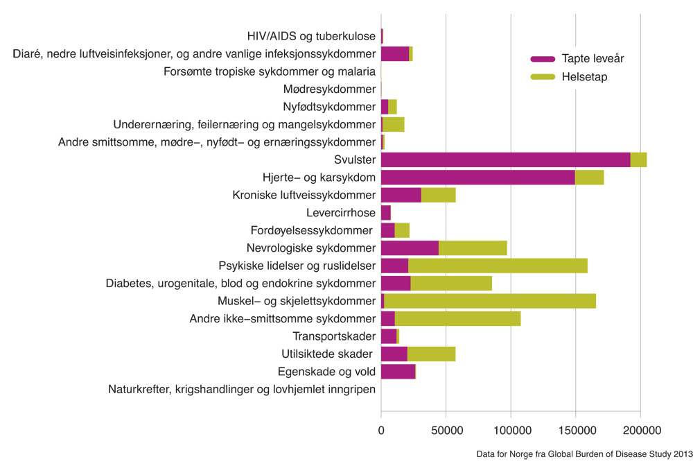 Muskel- og skjelettsykdommer, samt psykiske lidelser og ruslidelser er de viktigste årsakene til helsetap i Norge. Psykiske lidelser bidrar til betydelig helsetap i alle aldersgrupper, mens helsetap knyttet til muskel- og skjelettsykdommer øker med alder. Blant de 25 sykdommene og skadene som gir mest helsetap, er syv innenfor gruppen psykiske lidelser og ruslidelser, og til sammen utgjør disse 19 pst. av det totale helsetapet. Angstlidelser og depressive lidelser er spesielt store sykdomsbyrdegrupper. De 25 største bidragsyterne til DALY utgjør til sammen over 70 pst. av den totale sykdomsbyrden i Norge. Korsrygg- og nakkesmerter er den klart største bidragsyteren til antall DALY, med 10,5 pst. av den totale byrden, etterfulgt av dødelige sykdommer som iskemisk hjertesykdom, Alzheimers sykdom, hjerneslag og lungekreft. På grunn av det høye helsetapet de gir, er angstlidelser og depressive lidelser også viktige bidragsytere til DALY i Norge.»