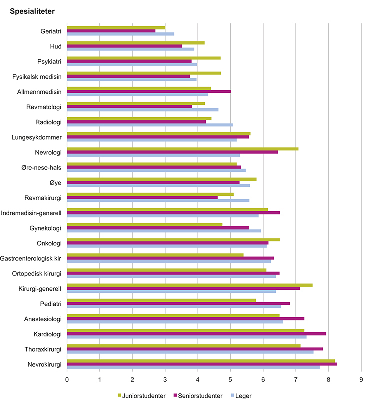 Figur 2.6 Rangering av ulike spesialiteters prestisje på en skala fra 1–9, der 9 angir høyest prestisje.