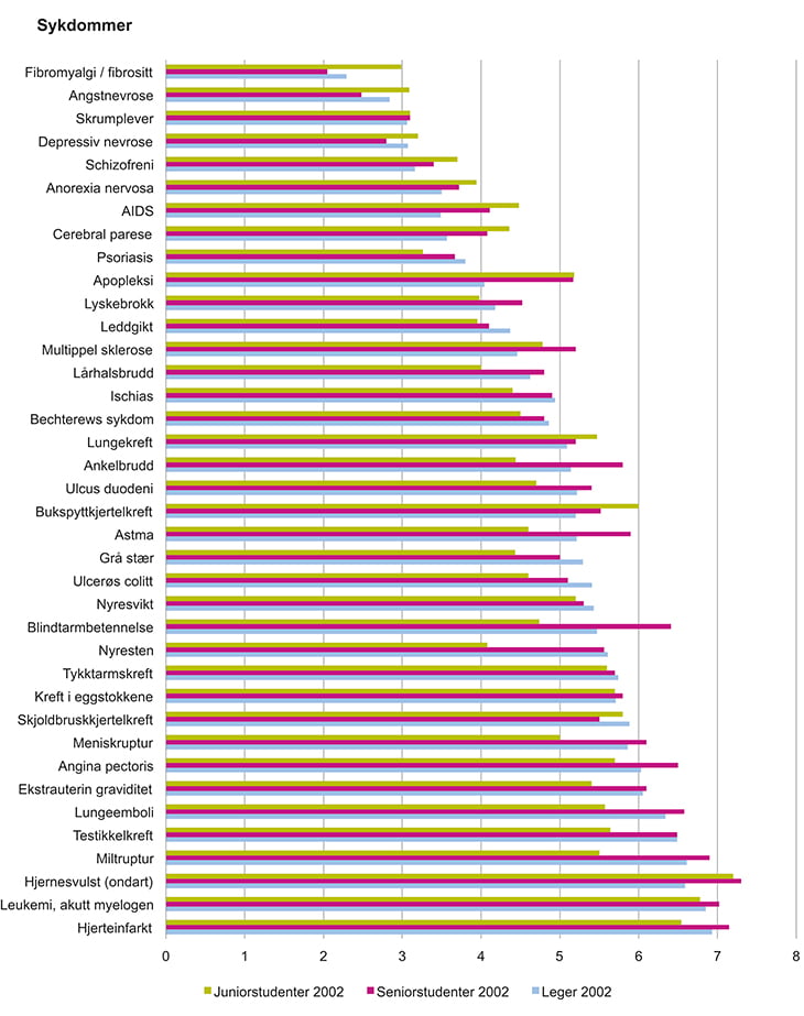 Selv om vurderingene er ganske like mellom juniorstudenter, avgangsstudenter og leger er det samtidig visse forskjeller6. Juniorstudenter tror helsepersonell flest gir sykdommene og spesialitetene som er lavest rangert en høyere prestisje enn avgangsstudenter og leger. Det skjer med andre ord en viss sosialisering internt i legegruppen, der studenter gjennom studieløpet adopterer eksisterende normer knyttet til ulike sykdommers prestisje.