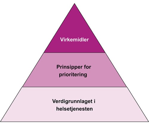 Figur 6.1 Verdigrunnlaget i helsetjenesten, prinsipper for prioritering og virkemidler for prioritering