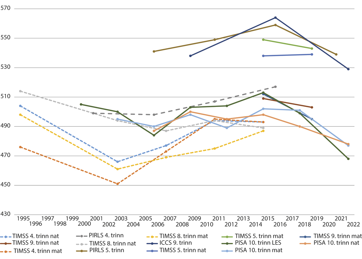I perioden 1995–2007 deltok norske elever på 4. og 8. trinn i TIMSS-undersøkelsene. Fra 2015 ble dette endret til 5. og 9. trinn, siden norske elever er yngre enn i mange andre land vi sammenlikner oss med. På liknende vis ble PIRLS-undersøkelsen i 2001 gjennomført med norske elever på 4. trinn, før både 4. og 5. trinn deltok i perioden 2006 – 2016. Fra 2021 deltar kun elevene på 5. trinn. Selv om PISA har målt både fagområdene matematikk og naturfag siden 2000, var det først i henholdsvis 2003 og 2006 at fagområdene var fullt utviklet og implementert for første gang. Den første ICCS-undersøkelsen ble gjennomført på både 8. og 9. trinn, men vi viser resultatene fra 9. trinn her siden Norge har deltatt med dette trinnet i de to neste undersøkelsene. Vi gjør oppmerksom på at resultatene fra undersøkelsene ikke nødvendigvis kan settes på samme skala for å direkte sammenliknes. Likevel kan det være relevant å se på utviklingstrekkene samtidig for å se om flere resultater peker i samme retning på samme tid.1