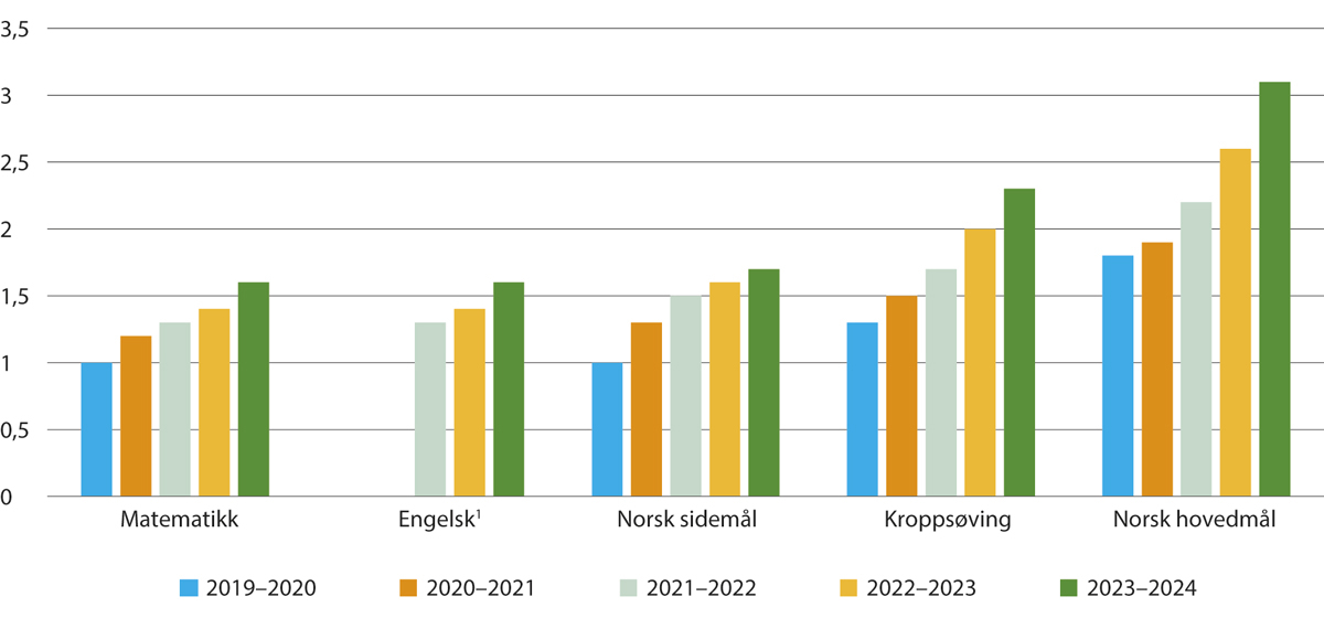 1 Før 2021–2022 fikk elevene to karakterer i engelsk, én for skriftlig, og én for muntlig. Det er derfor ikke inkludert tall for engelsk fra før 2021–2022.